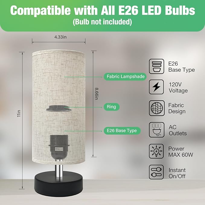- 【Instant On/Off 】This lamps for night stands set of 2 comes with an instant on/off switch and AC outlets(2-prong), plug and play, one-button switch, easy to install and use. Please note that bulbs are not included. (Please use the LED bulb, max watt of the LED bulb is 60W)