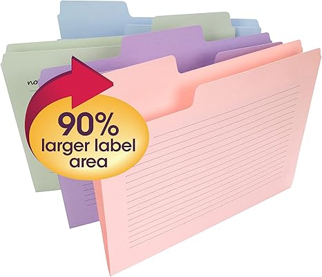 - Includes 12 letter size (11-5/8” W x 9-1/2” H overall, 8-5/8” body) SuperTab file folders with oversized 1/3-cut tabs that allow for larger fonts or more lines of description of folder contents